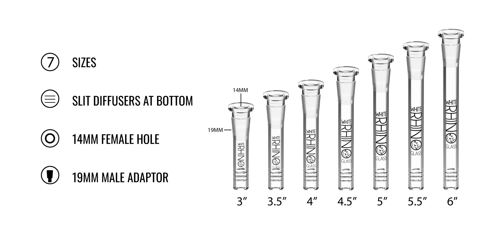 White Rhino Glass on Glass downstems are 19/14mm and are designed to hold a 14mm male herb bowl or banger. Each downstem features diffuser slits in the bottom that help with percolation. Sizes can vary +/- .25"